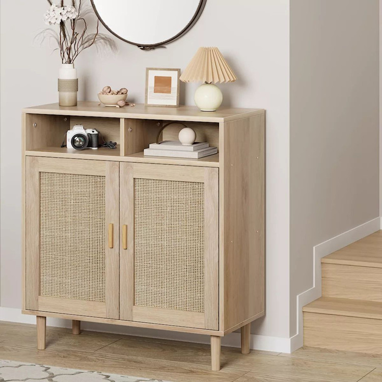 با جاکفشی یا کنسول دو در حصیری، زیبایی طبیعی چوب و حصیر را به دکور خانه خود بیاورید. این محصول با طراحی مینیمال و مدرن، از ترکیب چوب طبیعی روس، روکش راش و دربهای حصیری خارجی ساخته شده است تا جلوهای خاص، گرم و منظم به فضا بدهد.